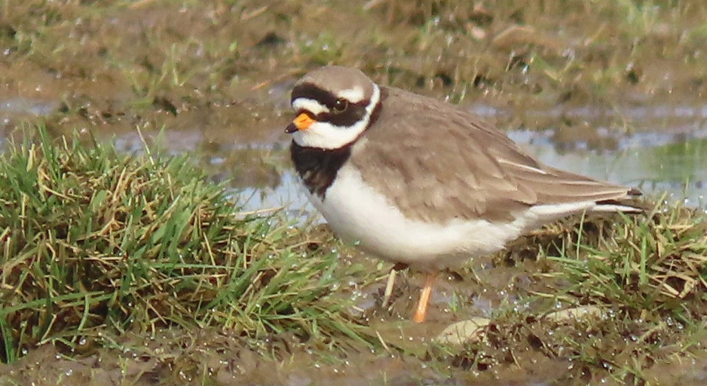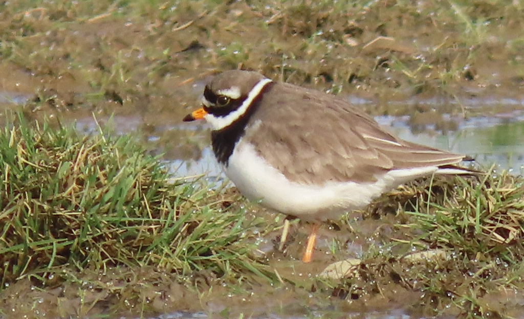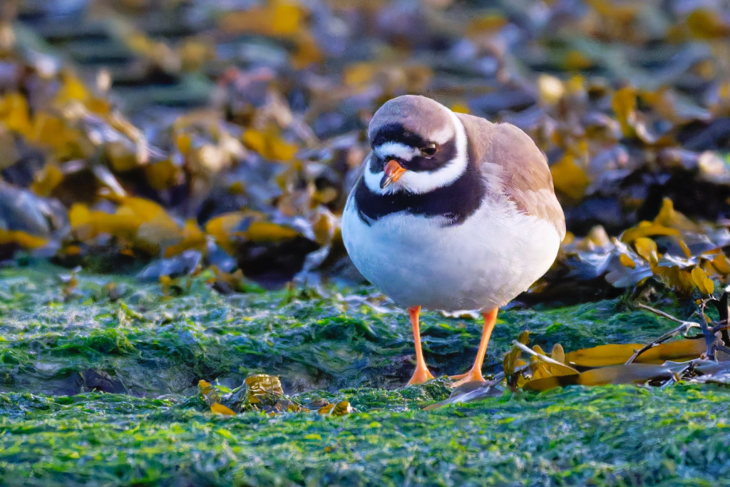 Ringed plovers can be identified by their orange legs and bold white wing stripe when in flight. Breeding adults have a bold black and white head and breast and a bright orange bill with a dark tip.